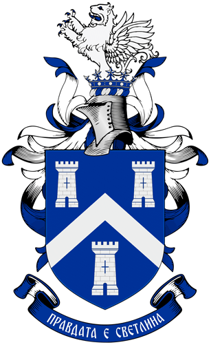 Azure, Chevron Argent between three towers Argent.